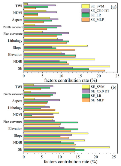 The importance of each predisposing factor reflects the contribution of the predisposing factor to landslide occurrence. These four models are essentially non-linear predictors based on the determination processes of the weights of corresponding predisposing factors. The importance ranks of these predisposing factors are evaluated depending on the relative values of these weights according to the inherent classification attributes of these non-linear predictors. It can be seen from Figure 8a,b that the relative importance of predisposing factors in the SE_SVM model is different compared with other models, in which the relative importance of SE, NDBI and slope are 23%, 19% and 17%, respectively, while other factors are relatively small under 30 m resolution. The same phenomenon also happened under 60 m resolution. On the whole, SE, elevation, NDBI, and slope make great contributions in all models under both 30 m and 60 m grid resolutions. Specially, the SE factor has the largest contribution in each model, with a relative importance in SE_MLP, SE_LR, SE_SVM and SE_C5.0 of 21.6% (14.15%), 17.32% (16.81%), 23% (23.86%) and 13% (14.29%) under 30 m (60 m) grid resolutions, respectively.