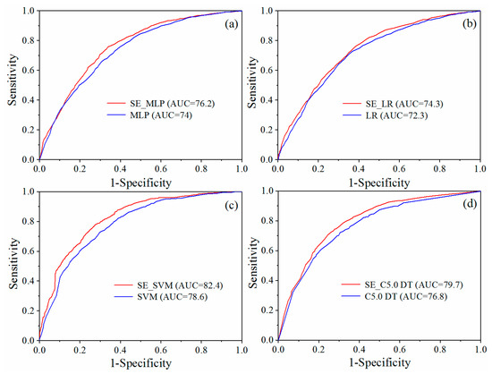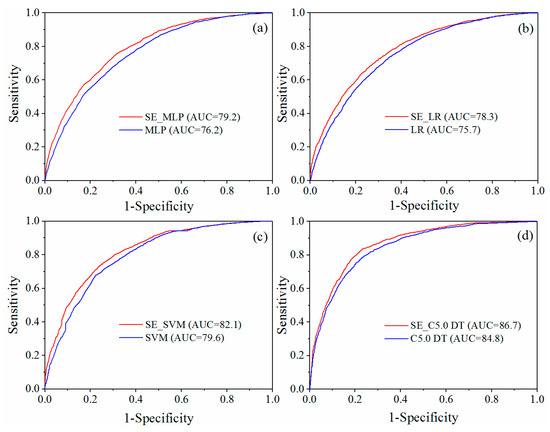 AUC value of each model with grid resolutions of 60 m: AUC values of SE_MLP and MLP models (a); AUC values of SE_LR and LR models (b); AUC values of SE_SVM and SVM models (c); AUC values of SE_C5.0 DT and C5.0 DT models (d).