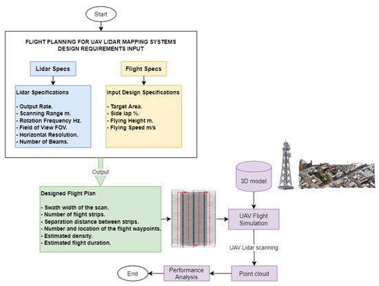 The developed methodology (Figure 2) consists of two parts—a flight planning tool part and some simulation tests on real-world scenarios. For every UAS LiDAR flight plan design, there are two types of input requirements—the LiDAR specifications and the flight specifications. LiDAR specifications, as mentioned earlier, include the scanning output rate, rotation speed, maximum scanning range, etc., while the mapping specifications are related to the shape and size of the target area, flight strips (lines) sidelap, flying height, and speed. The proposed methodology delivers the following output parameters: