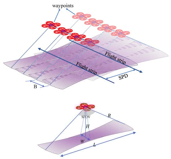 - Flight plan specifications: They include flying height H, flying speed m/s, and the required sidelap % between adjacent scanning strips. It should be noted that a larger overlap percentage ensures higher coverage but requires a longer flight time, which should be carefully considered.