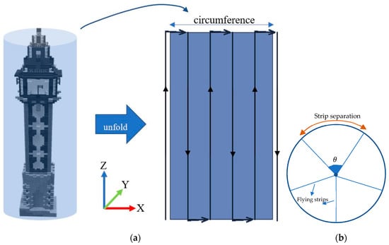 (a) Flight planning for a tower by unfolding a covering virtual cylinder into a plane. (b) A top view showing the conversion of the strip separation distances into angular values.