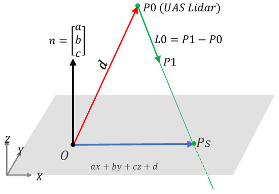 To simulate the UAS LiDAR scans, the scanning points are found when intersecting the LiDAR beams with the ground, assuming a planar ground surface without occlusions. Mathematically, the LiDAR scanning points are computed, as illustrated in Equation (9) [40,41]: