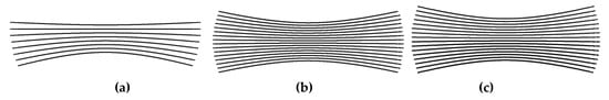 Simulated scanning patterns for the selected LiDAR types—Quanergy M8 (a), Velodyne VLP-16 (b), and Ouster OS-1-16 (c).