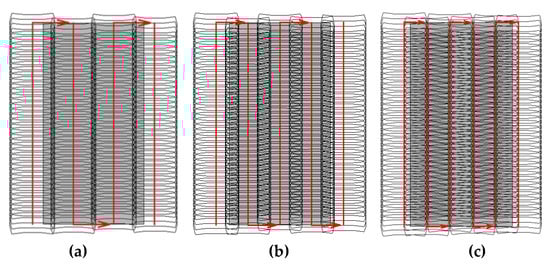 Flight plan sketches for mapping a rectangular area at different sidelap percentages, which result in different numbers of flight strips. (a) 10% sidelap—4 strips. (b) 30% sidelap—5 strips. (c) 50% sidelap—6 strips.