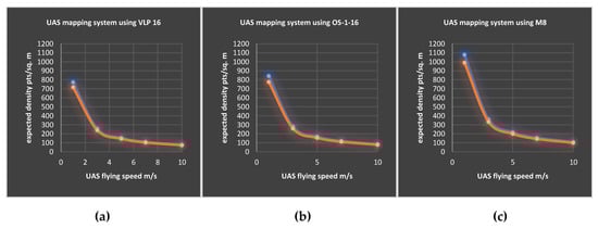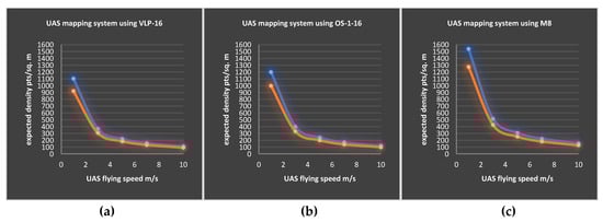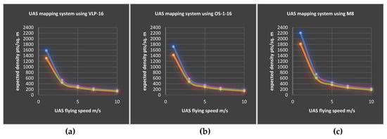 The relation between the UAS flying speed and the estimated point cloud density at a 10% sidelap, scanned at 30 m (blue) and 60 m (orange) by (a) VLP-16, (b) OS-1-16, and (c) M8.