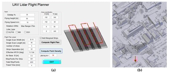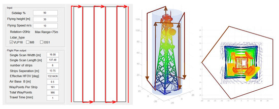 The realized MATLAB tool (Figure 7) requires some input parameters such as sidelap percentage, flying height, and UAS flying speed. For the reported tests, the LiDAR rotation is fixed to 20 Hz and the maximum scanning range is fixed to 75 m, within the manufacturer’s specifications.