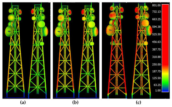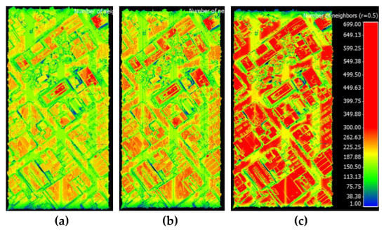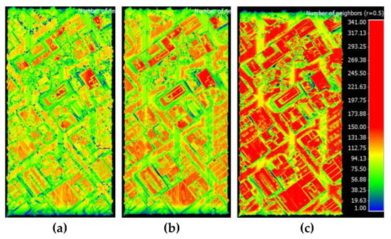 Color-coded visualization of the derived point clouds (red≥ 250 pts/m2) obtained by scanning the tower with the three LiDAR sensors: (a) VLP-16, (b) OS-1-16, and (c) M8.