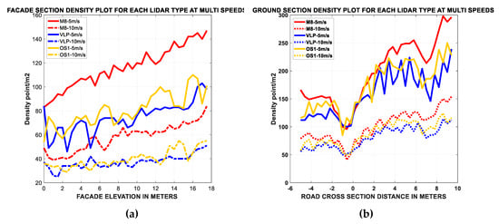 (a) Density on the selected facade slice and (b) the ground slice for Quanergy M8 (red), OS1-16 (yellow), and Velodyne VLP-16 (blue), at two different flying speeds.