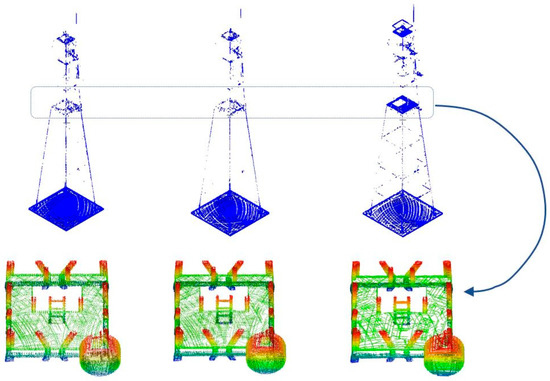 The proposed flight planning method is tested for the mapping of a communication tall structure. A freely available 3D model of a 120 m communication tower [44] (Figure 21) was used to analyze the results of the three UAS LiDAR mapping systems. Unlike the previous example, featuring large urban areas, here, we consider a vertical structure that required a different mounting form of the LiDAR instrument and a different strip configuration, in order to have a complete survey.