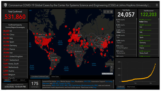 - Johns Hopkins University. Coronavirus COVID-19 (2019-nCoV). Available online: https://gisanddata.maps.arcgis.com/apps/opsdashboard/index.html#/bda7594740fd40299423467b48e9ecf6 (accessed on 29 March 2020).