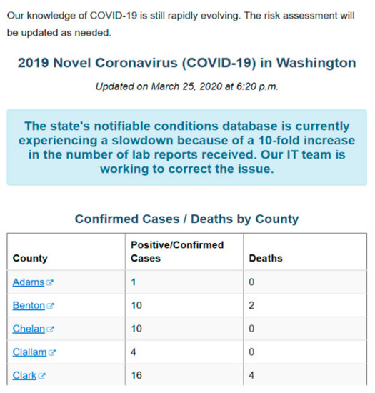 As a response to the COVID-19 pandemic, Johns Hopkins University, WHO, and several other organizations developed interactive web-based GIS dashboards to visualize and track globally reported cases in real-time [12,14]. Boulos and Geraghty [15] provide an overview of GIS and mapping dashboards that were developed for mapping the near real-time spread of COVID-19. These dashboards obtain data from a variety of open-source authoritative platforms that publish and update COVID-19 cases frequently. For the USA, these dashboards display information such as the number of confirmed cases, deaths, and recovered and active cases at the county level. Unfortunately, these dashboards do not provide detailed information and provide little to no use in locating and analyzing the space–time dynamics of COVID-19 at a detailed spatial resolution, i.e., large-scale areas. Given this, unfortunately, these dashboards serve as no more than a source of an impressive visualization tool for mapping COVID-19 in real-time. Washington State Department of Health (WSDH) created its own database and dashboard to display similar information at county levels [9]. However, on 25 March, WSDH announced (see Figure 2) that, “The state’s notifiable conditions database is currently experiencing a slowdown because of a 10-fold increase in the number of lab reports received. Our IT team is working to correct the issue”. With an increase in the number of confirmed positive cases and a slowdown in the updating of databases, these dashboards face difficulties updating in real-time. In the USA, as of 26 March 2020, the finest resolution of publicly available data for COVID-19 is the county level [16]. This, too, is not a fine enough scale to understand where and when COVID-19 spread. Sizes of counties can vary; a case identified in a county could be located anywhere within that county. This non-availability of data can be tied closely to three issues: first, maintaining the privacy of patients; second, avoiding panic amongst populations who live close to these COVID-19 cases; third, the lack of opportunity to create a detailed inventory of infected cases because of the prevalence of a huge number of cases.