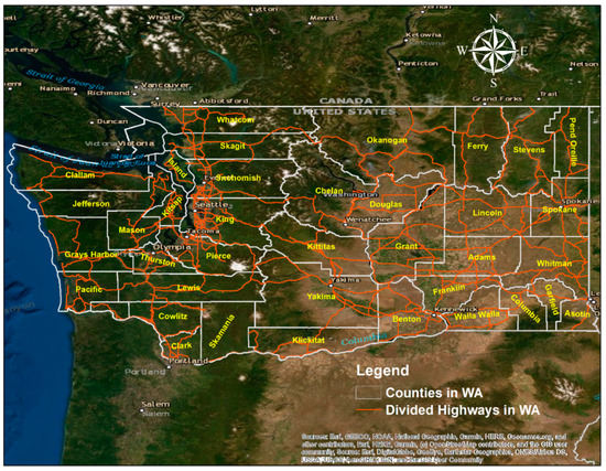 Study area displaying counties and divided highways in Washington State overlaid on top of a satellite imagery base map.