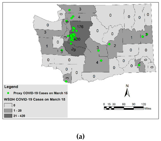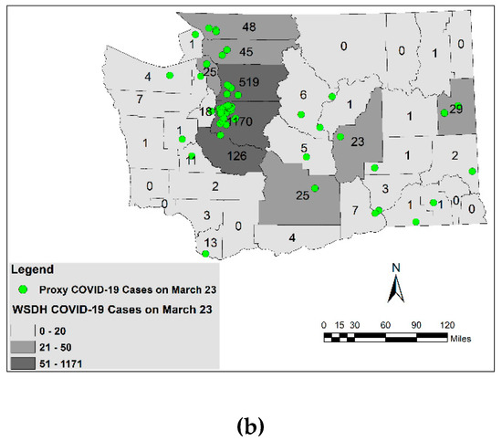 Proxy COVID-19 locations overlaid on top of WSDH COVID-19 case counts per county: (a) 15 March 2020; (b) 23 March 2020.