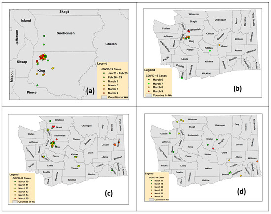 The spatial distribution of cases from 21 January to 4 March (see Figure 8a) reflects the concentration of initial cases in the west-central portion of WA. Cases were prevalent only in King and Snohomish Counties, in close proximity of patient zero and patient one. From 5 March to 9 March (see Figure 8b), as more cases continued to appear in King and Snohomish Counties, the first cases appeared in new counties, such as Kittitas, Grant, and Clark. Exposure of patients to COVID-19 in new counties remains unreported or unknown. However, it is possible that these cases might have come in contact with cases from previously infected counties. From 10 March to 15 March, four distinct clusters can be observed in the west-center, center, east-center, and southeast (see Figure 8c). Cases of COVID-19 from the original cluster in King and Snohomish Counties had diffused to neighboring counties in the northwest, such as Skagit, Whatcom and Island Counties, and Thurston County in the southwest. In the central cluster, out of three new cases identified in Kittitas County from 11 March to 13 March, one case had known exposure to an infected case, while the second case was a relative of a previously infected person in the county. Two cases identified in Yakima County, a neighbor of Kittitas County, had known exposure to a woman from Kittitas County, thus forming a second cluster on the map and providing insights into community spread in spatially closer locations. The third cluster was seen on 11 March in Columbia County, which is not an immediate neighbor of any of the infected counties, but rather far away. This is explained by the known international travel associated with this new case. The fourth cluster was observed in Spokane County, with four new cases. Although there has been no report of how the first case was infected, it is known that all other three cases had attended a school event at which they came in contact with the first case. Between 17–23 March (see Figure 8d), three new dominant clusters appeared in farther counties in the northwest, southeast, and central WA. COVID-19 had diffused further to new counties, such as Mason, Clallam, Jefferson, and San Juan in the northwest; Franklin, Bento, Walla Walla, Adams, and Whitman Counties in the southeast; and Chelan and Douglas Counties in the center. Note that Figure 8d shows only new cases that were detected from 17–23 March. This does not indicate a decline in the number of cases in existing counties. In fact, cases continued to grow in these counties, but unfortunately, given the high number of cases in existing counties, details of new cases were not reported by news agencies. In the southeast cluster, a new case with a history of international travel appeared in Franklin County on 17 March. Following this, new cases were detected in the same county and in neighboring counties, such as Benton on 19 March and Walla Walla County on 21 March. However, exposure in these cases was not reported. In the northwest cluster, new cases that appeared in Clallam County on 19 March had known exposure to a King County connection, while the Jefferson County case detected on 20 March had traveled within the country. As the number of cases increased with time, there were fewer details in the information provided about each case; only county names with few details were revealed. These cases are still of importance for this study, as they appeared closer to infected counties rather than in completely isolated locations. Although the presence of community spread cannot be confirmed with this information, it can neither be denied. Further analysis with real-world data can reveal exact spread patterns. Nevertheless, the current analysis shows clear signs of community spread, but, more importantly, these clusters evolved over time while appearing in new and distant locations. This analysis clearly displays the diffusion of COVID-19 cases from King and Snohomish Counties located in the center of WA towards distant counties with the progression of time. From 21 January to 6 March, which is a duration of more than a month, known non-travel-related COVID-19 cases continued to appear only in King and Snohomish Counties. Diffusion to other neighboring counties was observed only after 6 March. This suggests that enough time was available during the initial stage to implement preventive control strategies. Appropriate social distancing strategies, if implemented during the very initial stage of such infectious diseases, could help in suppressing the diffusion over farther distances and to new locations with time. As described by Hua and Shaw [11], “having correct and timely information is crucial for stopping its spread, as well as in the curative prevention of this disease.”