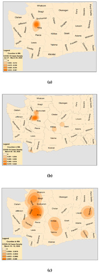 In order to map and understand the distribution of COVID-19 in WA over space and time, graphical methods, along with spatial point pattern analysis, were used. The goal is to map and analyze where COVID-19 proxy locations were concentrated and when and how they spread in time. Spatial statistical visualization and spatial measures of dispersion, such as kernel density estimation (KDE) and standard deviation ellipse (SDE) [24], were implemented to analyze spatial locations of COVID-19. Detailed descriptions of these methods are provided by Souris [24] and hence are not repeated here. These methods directly analyze spatial locations of COVID-19 and provide insights into its space–time spread. Moreover, attributes of COVID-19 cases were combined with these methods to gain geospatial insights into how COVID-19 spread from one location to another. Datasets were divided into four different time intervals, and KDE was implemented: (1) 21 January to 4 March (2) 5 March to 9 March, (3) 10 March to 15 March, and (4) 16 March to 23 March. Similarly, SDEs were calculated for three different time intervals: (1) 21 January to 6 March, (2) 21 January to 15 March, and (3) 21 January to 23 March. These time intervals were carefully selected so as to reflect the spread of COVID-19 into different parts of WA with time.