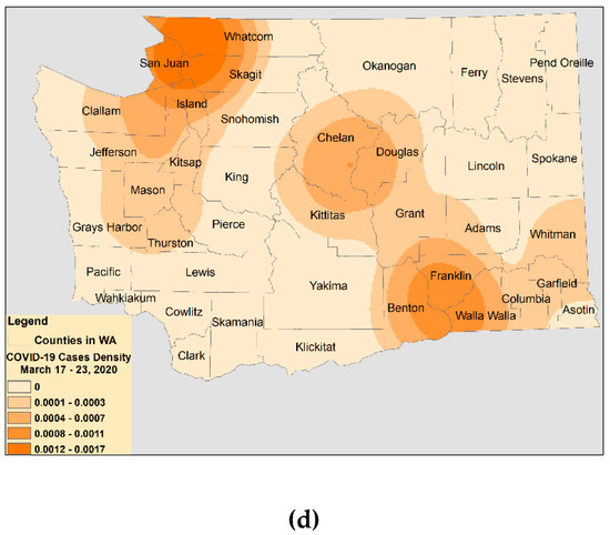Although the spread of cases was rapid from 21 January to 5 March, all new cases were observed strictly within Snohomish and King Counties (see Figure 6b). Between 6–9 March, cases spread to Kittitas and Grant Counties in the center and Clark County towards the southwest (see Figure 6b). From 10–15 March, cases appeared in communities that neighbor infected counties. For example, counties such as Skagit, Whatcom, and Island, located farther in the northwest and closer to King and Snohomish Counties, and Yakima County, located in the center and neighboring Kittitas (see Figure 6c). Infections in Spokane County towards the east were detected on 14 March. Finally, by 17–23 March, the farthest counties in the northwest and southeast had discovered their first cases of COVID-19, for example, new counties such as San Juan, Clallam, and Jefferson in the northwest and Benton, Walla Walla, and Whitman in the southeast. Although cases with histories of international travel appeared in Columbia and Franklin Counties in the southeast on 11 March and 17 March, respectively, cases without any history of travel were observed in this area only after 19 March. However, it is not clear if other cases are the result of diffusion from the new case with a history of international travel or if they can be attributed to the diffusion of infections from close contact in other infected counties.