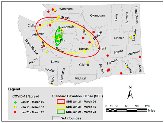 In order to understand the directional trends of the spatial distribution of COVID-19 cases over time, SDEs were calculated for three different time intervals (see Figure 9). SDE from 21 January to 6 March shows that COVID-19 cases followed a narrow north–south trend. Spread was more rapid in the Y-direction than in the X-direction, and cases were seen dispersed from Snohomish County in the north to neighboring King County in the south. The fact that this narrow spread was concentrated specifically towards the western edges of both the counties seems unsurprising because of the presence of a high population density, as well as the presence of patient zero in Snohomish County. As described in Section 2.1, both these counties are prime locations for major companies with strong public transit set-ups, and it is common for people to commute daily between these counties. A major highway, I5, connects these counties for daily commutes between residential areas and technology companies.