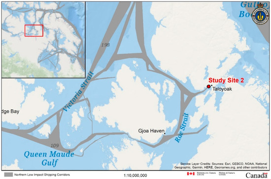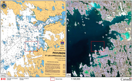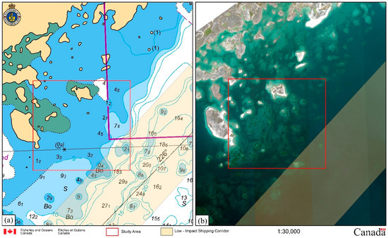 Outline of study site 2 near Taloyoak and the Northern Low-Impact Shipping Corridor in (a) Chart 7701 and (b) a WorldView-2 image acquired on 13 August 2017. ©2017, DigitalGlobe, Inc.