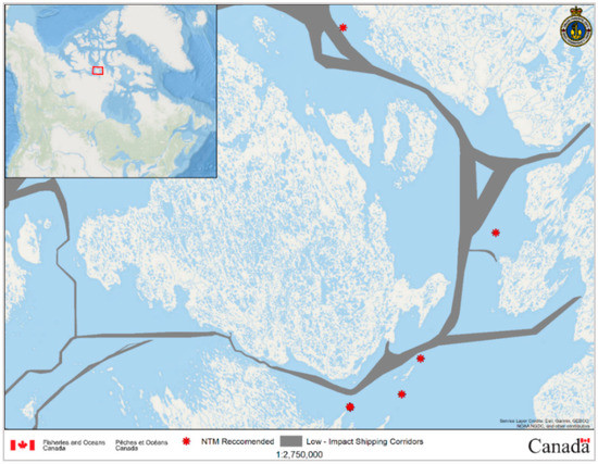 - Chénier, R.; Abado, L.; Sabourin, O.; Tardif, L. Northern marine transportation corridors: Creation and analysis of northern marine traffic routes in Canadian waters. Trans. GIS 2017, 21, 1085–1097. [Google Scholar] [CrossRef]