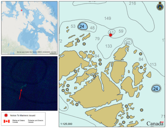 When scanning the corridors for hazards to navigation, five notices to mariners (NTMs) were issued. Figure 7 represents the distribution of the notices that were issued by CHS to chart these shoals. Figure 8 shows an example of an NTM that was issued for an uncharted shoal, which was discovered from a visual scan of Landsat, Sentinel-2 and PlanetScope imagery. The CHS Electronic Navigational Charts (ENC) number CA273274 shows a depth sounding close to the uncharted shoal of 41 m. This shoal represents a hazard to navigation due to its proximity to this depth sounding. Currently, the International Hydrographic Organization (IHO) S-4 standard (specification B424.7) recognizes the use of satellite imagery to chart shoals. “In areas where reliable hydrographic survey data is very limited or non-existent, it may be possible to identify shoal areas by reference to other sources, for example: satellite imagery” [26].