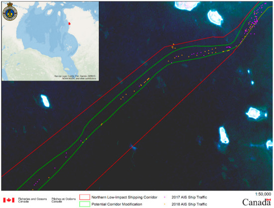 The Government of Canada announced in its budget of 2012, the World-Class Tanker Safety System Initiative (WCTSS), to strengthen Canada’s regime for ship-source oil spill prevention, preparedness and response [1]. Under this initiative, Fisheries and Oceans Canada (DFO), through the Canadian Coast Guard (CCG), the Canadian Hydrographic Service (CHS) and in collaboration with Transport Canada (TC), was responsible for developing the Northern Low-Impact Shipping Corridors initiative. The work on defining navigational corridors is now continuing under the Oceans Protection Plan (OPP). The corridors were created with the following objectives in mind: to improve marine safety, support responsible shipping, protect Canada’s marine environment, and build stronger partnerships with indigenous and coastal communities [2]. In order to meet the objectives, several factors need to be considered when defining the boundaries of the corridors [3]; within the scope of OPP, the Government of Canada is conducting engagement sessions with Northern communities to ensure their needs and concerns are addressed. Under WCTSS and OPP [1,2], new investments were made to increase safety to navigation in the Canadian Arctic, including fitting CCG vessels with multibeam sonar in order to collect more hydrographic surveys [4]. For prioritizing its survey and charting efforts, CHS developed a geographic information system (GIS) model called the CHS Priority Planning Tool (CPPT) [5]. The CPPT encompasses many GIS data layers, including the corridors, to ensure safety to navigation. Even if significant progress has been made under these initiatives, only 13% of the Canadian Arctic is currently considered to be adequately surveyed. Adequate survey coverage of the corridors sits at 31.5%.