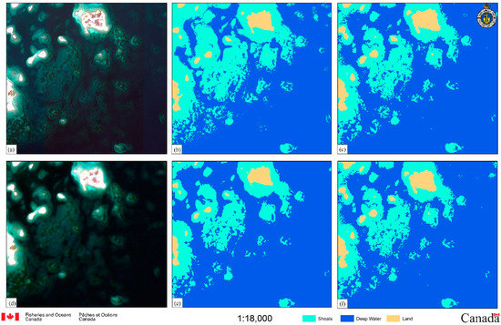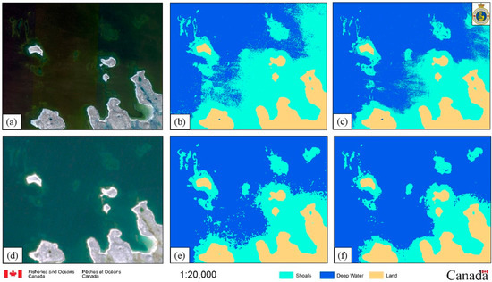 It appears that the RF model performed approximately 2–3% better than CNN for every classification except for the Sentinel-2 classification of Site 2 which performed slightly worse. Overall, there was little difference and both models seemed to have similar strengths and weaknesses. It seems that a common challenge for all classifiers is identifying shoals located in deeper water where there is less contrast between the features and clear water. All classifiers do an excellent job of identifying land, which is likely due to the NIR band included in the analysis. However, when looking closely at the CNN classifications for Site 2 (Figure 11b,e), there are two very small islands which were misclassified as shoals. In terms of safety to navigation, this error is negligible since either a shoal or land is an obstruction to be avoided.