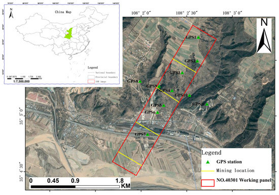 Geographical location of the NO.40301 working panel in Dafosi coal mine and Global Positioning System (GPS) stations with the corresponding Google Earth image as the background.