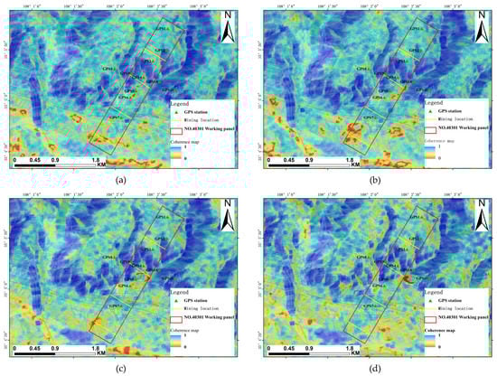 Figure 2a–d shows the DInSAR coherence maps. As an indicator evaluating the quality of an interferogram, the values of a coherence map are defined as dimensionless quantities from 0 to 1. Higher values mean better image quality. The coherence value is more than 0.2 in most areas. There is a cornfield in the southern section of the working panel; the growth and harvesting from July to October induce incoherence. Even so, the quality indicated by these coherence maps is good enough for the unwrapping phase.