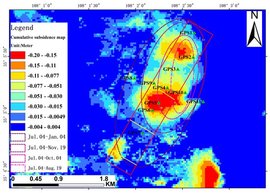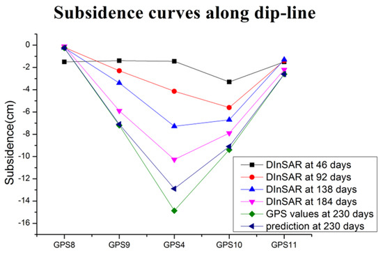 The consecutive subsidence monitoring data acquired from the DInSAR dataset (Table 1) were used to conduct subsidence prediction. There were 11 GPS stations above the working panel (see Figure 1), selected as prediction objectives. The GPS monitoring results could then be used as verification data. Figure 4 is a cumulative subsidence map; it displays the cumulative subsidence value at 184 days. The spatial resolution is 30 m. There are four dotted purple outlines which circle four sub-regions of subsidence area in different periods; they are consistent with forward movement of the footprint of differential interferometry phase maps. The DInSAR results were converted into vertical subsidence from LOS displacement. The GPS monitoring results, DInSAR results, and prediction results for these 11 stations are shown in Figure 5 and Figure 6.