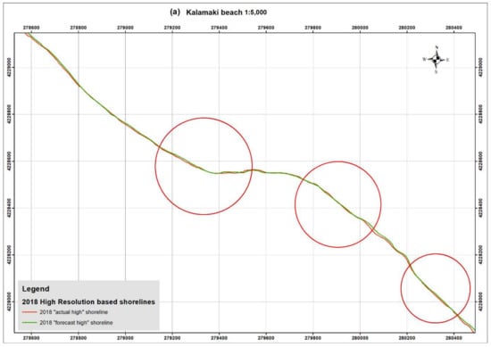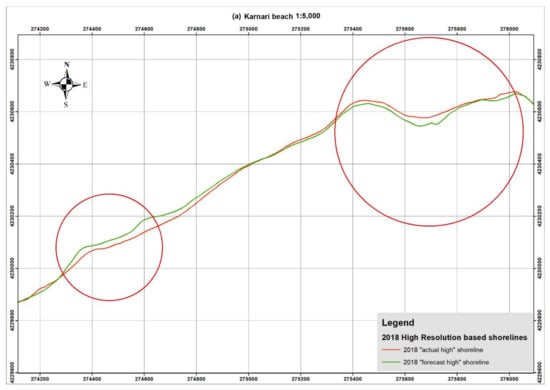 In Figure 4a, on the Kalamaki beach, shown in red, the shoreline extracted from 2018 Worldview-2 is presented and overlaps with the 2018 “forecasted high” shoreline, which is illustrated in green at a 1:5000 scale. In addition, in Figure 4b, the “actual” 2018 shoreline digitized from the Landsat (OLI 8/TIRS) multispectral image, the 2018 “forecasted low” shoreline, and the shoreline extracted from 2018 Worldview-2, shown in blue, green, and red, respectively, are overlapping in the same place and scale. In Figure 5a,b the corresponding presentations, shown in the same colors, are also presented for the Karnari beach at the same scale. There are three areas in Kalamaki beach and two areas in Karnari beach (red cycles) (Figure 4 and Figure 5) where the deviation in the low-resolution data is obvious in high-scale mapping.