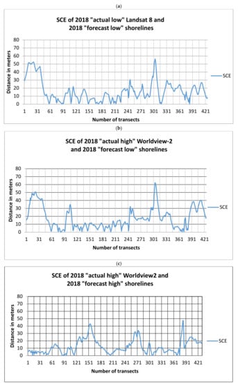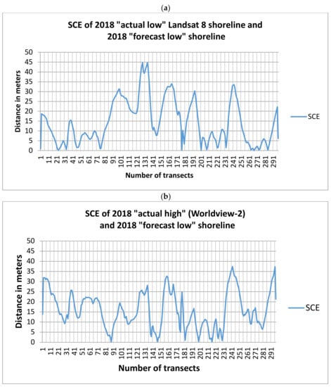 Furthermore, except for the graphical comparison described above, we need to enumerate the accuracy of the results. For that purpose, a new geodatabase was created, and the existing 2018 Landsat shoreline and the shorelines based on DSAS v.5.0 2018 forecasting were imported. The same procedure was followed for the shorelines from the high-resolution data. The shoreline change envelope (SCE), which represents the greatest distance among the intersection points between shorelines and transects being produced, was calculated for every pair of 2018 shorelines based on the low- and high-resolution data from the test sites (Figure 9).