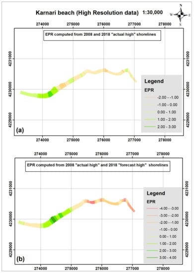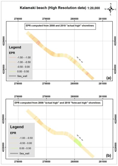 In Figure 12, the ERP rates are computed for the Karnari beach from both low- and high-resolution data. Furthermore, in Figure 12a, the EPR rates from the 2008 and 2018 “actual high” shorelines are presented, while in Figure 12b, the respective EPR rates from the 2008 “actual high” shoreline and the 2018 “forecasted high” shoreline based on the high-resolution data are presented. The respective EPR rates derived from the low-resolution data are presented in Figure 12c,d.