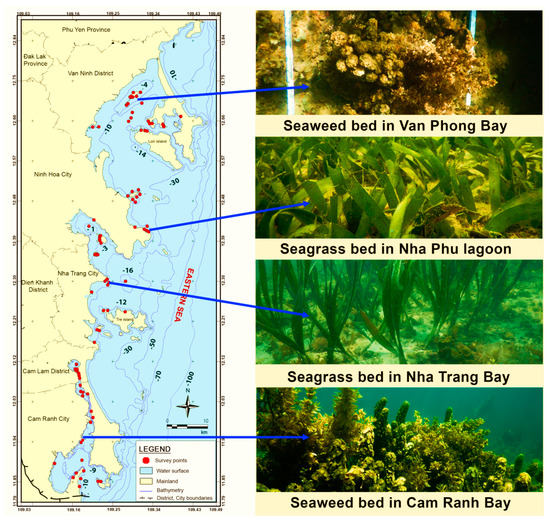 Vietnam is a coastal country located on the western side of the Eastern Sea (Biển Đông); it has 3260 km of coast, and a highly diverse assemblage of submerged aquatic vegetation (SAV) [1,2,3], which consists of two main groups-seagrasses and seaweeds. Seagrasses are flowering plants, while seaweeds are macro algae consisting of aggregating cells [2,4,5]. SAV is usually distributed in coastal estuaries, brackish lagoons, and tidal regions, which are habitats and food sources for most aquatic organisms [4,5]. There are over 800 seaweed species in Vietnam, with about 121 of these having high economic value or potential to treat pollutants [2,6]. Fifteen seagrass species have been identified in Vietnamese coastal waters, and while the number of Vietnamese species is low, their root systems hold on to the ground, protecting benthic organisms and reducing coastal erosion. They also absorb carbon from the ocean, help purify the aquatic environment, and provide raw materials for several industries [2,6].