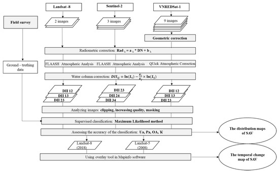 Data collection, analysis, and processing were carried out using ENVI 5.5 and MapInfo 12.0 software. The process flow chart for mapping SAV temporal changes can be seen in Figure 3.