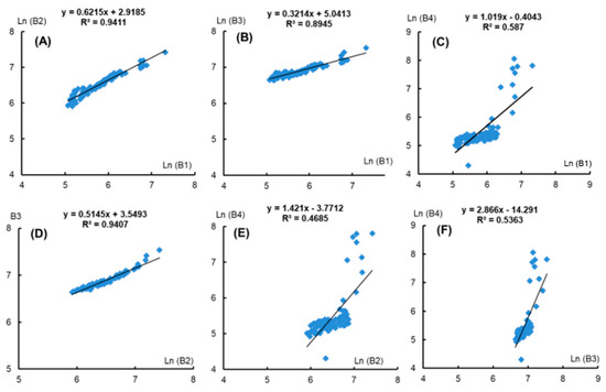 This index allowed conversion of surface reflectance and bottom reflection, and we had a total of 101 points, including 47 sandy points and 54 SAV points, from which to build the linear relationship between the reflection spectra of image band pairs. The linear relationship of band pairs, using randomly selected sand beds at different depths, formed the basis of the DII calculation, which was completed using Equation (2) [40]: