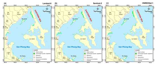 SAV distribution maps for Nha Phu Lagoon, using data from three satellites: (a) Landsat-8 (2018), (b) Sentinel-2 (2019), (c) VNREDSat-1 (2017).