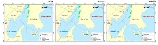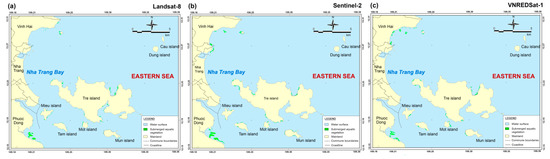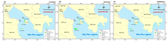 SAV distribution maps for Van Phong Bay, using data from three satellites: (a) Landsat-8 (2018), (b) Sentinel-2 (2019), (c) VNREDSat-1 (2017).