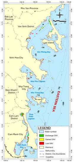 It has been suggested that SAV in Khanh Hoa has been tending to decrease, both temporally and spatially, however, SAV dynamics have not been validated with any degree of accuracy. SAV ecosystems in Khanh Hoa province are widely distributed, in terms of their depths, substrates, and geographical locations, and include significant reserves [8,9,10]. These issues make them difficult to investigate and manage, suggesting that two modern tools—remote sensing and geographical information systems (GIS)—should be applied to overcome these challenges [11]. These tools can assess not only SAV distribution, but also its quantity and productivity, with high accuracy [12,13,14]. Numerous satellites that could be used to support managers in their planning for sustainable economic and social development exist, with many offering high spatial resolution, return rates, and numbers of bands [15,16,17].