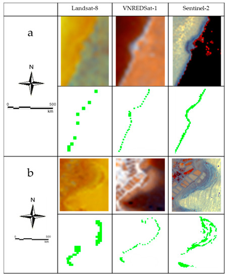 The Vietnamese Natural Resources, Environment, and Disaster Monitoring Satellite (VNREDSat-1) was the first Vietnamese satellite, launched on 7 May 2013, and including one instrument, the New AstroSat Optical Modular Instrument (NAOMI). NAOMI has fewer spectral bands than either L8 or S2, and includes four multi-spectral bands, each with a spatial resolution of 10 m (Table 1). V1 repeat cycle is more than L8 and S2, has a 29 days repeat cycle. Data from this satellite have been used for several environmental monitoring projects; the data are available from the end of 2013, and they has proven to be effective in several fields, although very few researchers have used them for coastal resources monitoring [34,35]. There has been one study on wetland ecosystems, carried out by Nguyen [36], while none concerning SAV distribution have been published. The wavelengths and spatial resolution characteristics of each sensor are listed in Table 1.