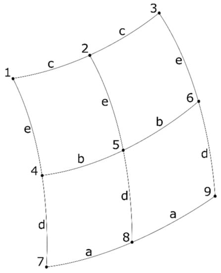 A 3 × 3 spheroidal equal angular grid with linear geometries a, b, c, d, and f, and nine elevation nodes—adapted from [8].