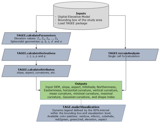 In this paper, we aimed at describing and making available a user-friendly processing algorithm for performing terrain analysis in GEE. This algorithm takes advantage of GEE’s high-performance architecture for making the computational analysis scalable, adapted to customized needs, and requiring minimal user input. For this, the proposed package takes advantage of a calculation method adapted for spheroidal elevation grids, which favors the global-scale analysis of different DEM resolutions without projecting elevation data.