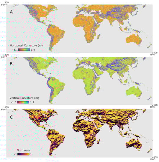 Example of terrain attributes calculated from TAGEE package and 1 arc-second SRTM DEM, displayed for the near-global extent at the visualization level 3 (~20 km pixel resolution): horizontal curvature (A), vertical curvature (B), and Northernness (C).