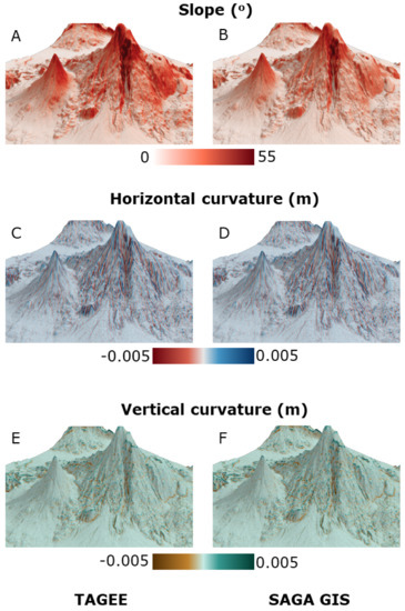 When TAGEE outputs were compared to those from SAGA GIS (Table 2), the statistical evaluation resulted in a significant and high correlation for the slope, horizontal and vertical curvatures of terrain (Pearson’s r of 0.98, with an error difference of 3 and 4%). Aspects from TAGEE and SAGA GIS had an inferior correlation coefficient, but the result was higher than the aspect from the algorithm of GEE. The region of Mount Ararat was also used to visually compare the slope, horizontal and vertical curvatures, calculated from both TAGEE and SAGA GIS (Figure 4). The 3D visualizations revealed a high similarity between both maps, but some small differences can be visualized by the color intensity. This is the case of the slope of the Mount Ararat calculated by TAGEE (Figure 4A), which had a higher intensity compared to the slope of SAGA GIS (Figure 4B). A slightly higher intensity for the vertical curvature calculated by SAGA GIS was also evident on an edge of the Mount Ararat (Figure 4F). Despite being small, these visual differences confirm the relative error of both methods (Table 2). In addition, the spatial patterns of aspect, slope, and curvatures from TAGEE presented a high correspondence with the terrain maps of Mount Ararat available in [8,29], reinforcing the confidence of the TAGEE calculation method.