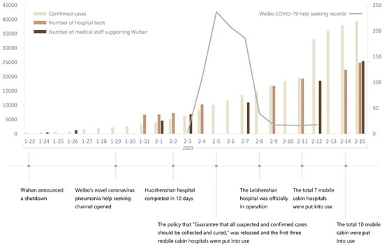In the early days of the lockdown, Wuhan, as the epidemic center, faced great challenges. The panic caused by COVID-19 outbreak stimulated a large number of people to enter the hospital, leading to a short-term collapse of medical system. Such a squeeze on medical resources also prevented many diagnosed and suspected people of having COVID-19 from receiving timely treatment. More than 1000 families in Wuhan posted help information on Sina Weibo, a Chinese social media platform, seeking immediate medical treatments. Most information was posted from February fourth to eighth, and then decreased rapidly, when the policy that “Guarantee that all suspected and confirmed cases should be collected and cured” was released on February fifth and a series of measures were taken by the government to quickly supplement medical resources, including increase the number of medical beds and medical staff supporting Wuhan (Figure 1).