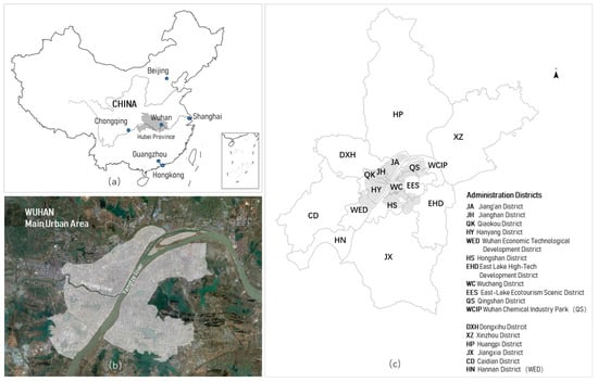 Map of the study area in Wuhan, China: (a) the geographic location of the Wuhan, China; (b) the main urban area of Wuhan (MUA); and (c) administrative districts of Wuhan.