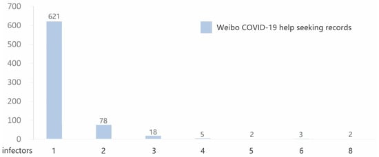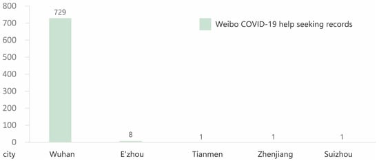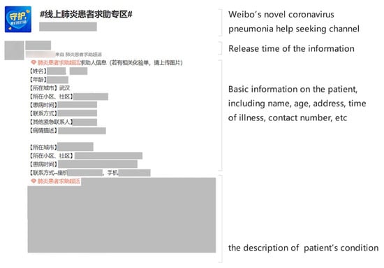 Sina Weibo is one of the most influential social media platforms in China. It had 486 million monthly active users by the end of June, 2019 []. In the early stage of the COVD-19 epidemic, due to the short-term collapse of medical system, Weibo opened the novel coronavirus pneumonia help seeking channel [] to help patients who could not get timely treatment. The help seeking records were mainly from February 3rd to February 12th, 2020. The study collected about 1200 Weibo records under the topic of “novel coronavirus pneumonia help-seeking” and considered valid information including name, age, home address, time of illness, and number of people infected (Figure 4). As such, 740 records of valid information were finally obtained after data cleaning, wherein 729 records were in Wuhan (Figure 3).