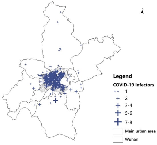 According to the statistics of the number of household infectors reported in each single record, most records reported one to two infections, with the highest number of eight, reflecting the severity of clustered infections in families (Figure 8). The spatial distribution of COVID-19 cases of Weibo data in MUA showed relatively concentrated regional patterns in Hankou, northern Hanyang, and Wuchang (Figure 9).