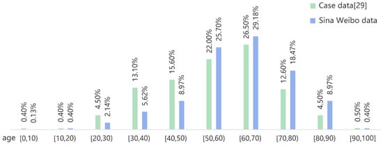 There are 691 records containing age tags, wherein the maximum age was 95 and the minimum was 11-months. Among them, the proportion of infectors between 30 and 69 was 69.47%, which was lower than the corresponding proportion of 77.2% in the whole sample of Wuhan till February 11th, 2020 [], and the proportion of infectors over 60 was 57.02%, which was higher than the corresponding proportion of 44.1% in the whole sample of Wuhan, showing that the susceptible population of novel coronavirus was mainly the middle-aged and the elderly groups. Moreover, the elderly who suffer from basic diseases are more likely to develop into critical patients, making the elderly patients become the group that accounted for more than half of Weibo help seekers (Figure 7).
