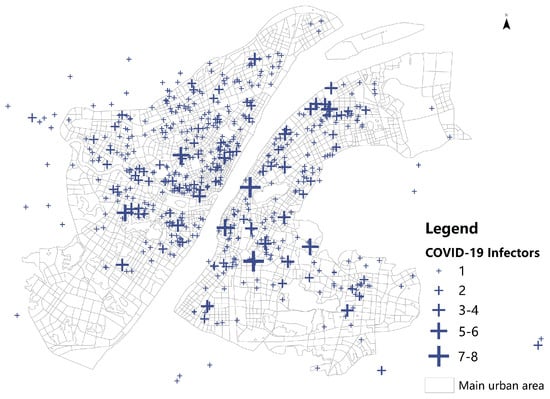 The existing researches include the spatial-temporal dynamics study of COVID-19 on the country level [,,], with the deficiency of the detail reveal of the characteristics in the early stage in the urban space, which is critical for the development of prevention and control work in the city during the epidemic. The outbreak of COVID-19 verifies that epidemic prevention in public health is an essential part of urban planning and governance [,]. It is important to understand the heterogeneity of urban space in terms of social space and geographic space in the city [], to identify susceptible people [,] and disease-prone spaces, and to grasp the dynamic spread of infectious diseases in urban spaces []. Thus, preventive control nodes can deploy corresponding measures for specific groups and spaces [,].