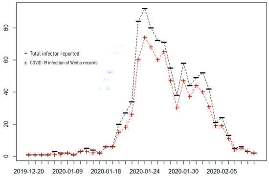 Timing chart of COVID-19 infection of Weibo records and total infector reported